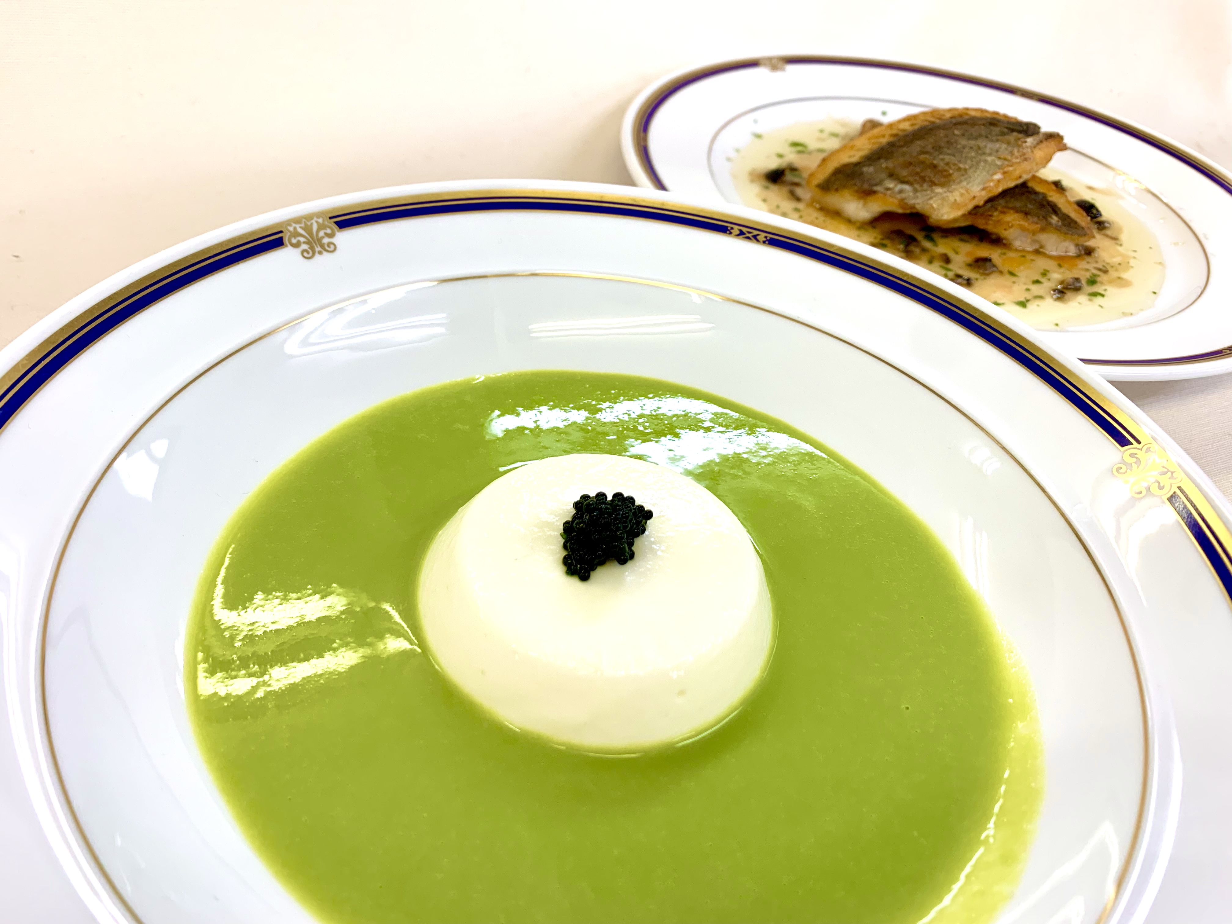 グリンピースのソースにキャビアものって、素材の味が引き立ちます!