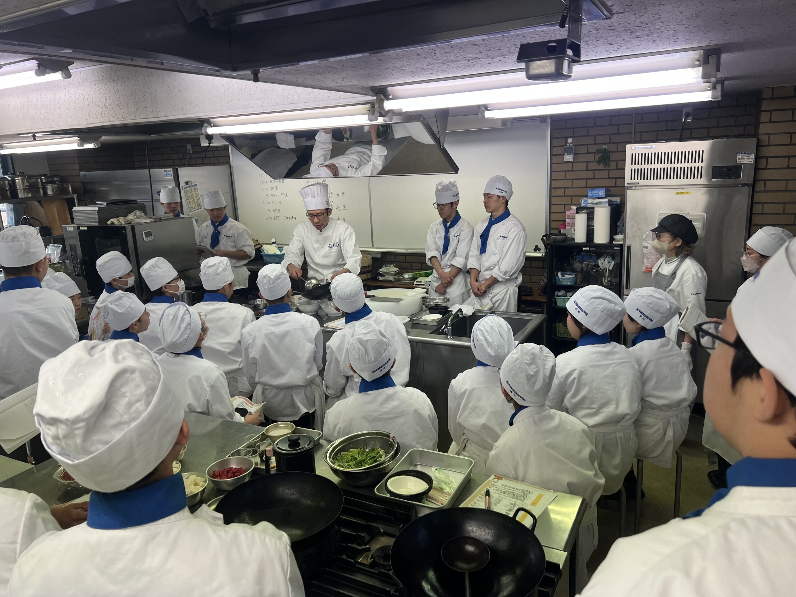 講師の先生はテレビ朝日系列『DAIGOも台所』にも御出演されている、河野 篤史先生です。他に行方先生、谷先生と3名の先生が来てくださり、中国料理の調理実習を行ってくださいました。